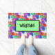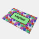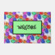ようこそ書は黒いスクリプトでミント緑の背景を持つ。おもしろいアートの花絵を描柄と水色が赤、青、ピンク、白、黄、緑、オレンジ、紫と白い背景に小さな緑の円を付けている。TamiraZDesignsによる原画。