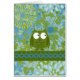 青および緑色の花パターン背景が付いているハートのリボンのかわいいフクロウ。 おもしろいの多彩でガーリーなデザイン。
