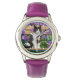 可愛い白黒の二色の猫、ヨーロッパショートヘアは、紫色の庭の花の前の木製の椅子に座っている。写真はKatho Menden氏。この時計は猫好きのギフトアイディアだ。