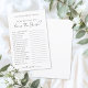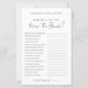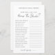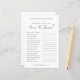 ミニマシンプルリストブライダルシャワーゲーム – 花嫁を知ってるか?来賓は一連の質問に答え、花嫁を知り、おもしろいを追加し、お祝いに魅力的な活動を行う。このデザインは、クリーンでミニマルな外観のための白い背シンプル景を持っている。フォントは濃い灰色の中で与えも、全体的に黒と白の外観が柔らエレガントいtouch。手書きのスクリプトとクラシックセリフのフォントのミックス保は、時間とシックなスタイル。完全にカスタマイズ可能で、質問、フォントの色、および背景を編集して、ブライダルシャワーテーマに合わせることができます。