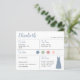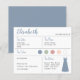 ダスティーブルーのドレスを着た介添え人の情報カードで、結婚式の日程や場所、結婚式の色、介添え人用のドレス、介添え人への提案メッセージなどが含まれています。左上隅には、ダスティーブルーの手書きのようなフォントで介添え人の名前が書かれています。右下隅には、ダスティーブルーのドレスがあります。中央には、結婚式の色が円形で表示されています。結婚式のドレスの色など、色は変更可能です。