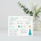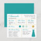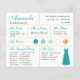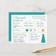 ティールとゴールドのウェディングのための花嫁の介添え人情報カード。ウェディング日程と場所、ウェディングカラー、花嫁の仲間、介添え人ドレスと介添え人への提案メッセージについての情報が含まれる。介添え人の名前とタイトルは、ティールブルーの優雅なスクリプトで書かれている。下隅にティールドレスがある。中央に、円でウェディングカラーがある。ウェディングドレスの色を含めたカラーは、ゴールドの円(偽ゴールド箔)を除いて、変更可能。デフォルトカラーは、ティール、ミントの2色調、ホワイトとゴールド。裏面は、介添え人ドレスの色であるティール。
