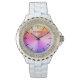 花嫁の結婚式の引き出物時計ギフト。白いブレスレットとグラデーション虹色のダイヤル顔と華やかなデザイン。独自の名前と日付パーソナライズされたを追加する(オプション)。エレガントタイポグラフィテンプレートカスタムモノグラム。上品なユニークブライダルクルーのプレゼント、点景、メイド・オブ・オーナー(花嫁付き添い人)、チーム、部族、ポーズ、花の女の子、友人、家族など。直径のまわりに29mm、ストラッのまわりにプ18mm。ピンクモダンや紫など色のフェミニンダイヤル顔なし。水晶石のベゼル。豪華な腕時計はトレンディーレディースのための。