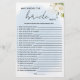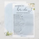新婦祝と一緒にエレガント誰が新婦を知っている?ゲーム,ロマンチックな青い水色と白いバラのテーマで設計。このゲームはブライダルシャワーやバチェロレットのパーティーに最適で、おもしろいや個人的な質問と花嫁の知識をテストすることができます。フローライベントスイートに合わせて美しくデザインされた、スタイルとエンターテイメントを融合した美しい記念品とアイスブレーカー
