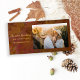 自然カスタマイズな茶色の色の秋の秋の挨拶の写真カードあなた自身の個人の写真と名前を持つや感謝祭のグリーティングカードを作成する。この季節の秋フォトカードの背景には、色鉛筆の効果でデジタルで強化された茶色の韓国のカエデの木葉地の自然写真が含まれる。