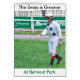 草はBelmontのパドックで緑です。 彼がこの甘美な芝生の方に指すと同時に黒い点が付いているジョッキーの"ジョン微笑および幸せなVelasquez"の身に着けている白い絹はElmont、NYで、この歴史的な競技場の緑の牧草地に入ります。 背景はパドックの白い柵を囲む画像的な緑の表記を展示します。