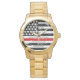 祝と、この薄い赤線の消防ウォッチで優れた消防士に感謝を示す – 消防旗の色のアメリカ国旗のデザイン、動揺してデザイン。サービス賞、消防記念日の贈り物、消防士の引退の贈り物に最適。名前、勤続年数、勤続年数、消防署でこの消防士の定年ウォッチをパーソナライズ。COPYRIGHT © 2020 Judy Burrows, Black Dog Art - All Rights Reserved.薄型レッドライン消防パーソナライズされた戦闘機リタイアウォッチ