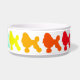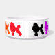 Colorful design with the bowl ringed with silhouettes of poodles in a rainbow of colors.