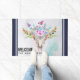 ようこそパーソナライズされたターコイズとパステルウォーターの色の背景を持つdoormat。フローラの花束を頭に載せ、小さな蝶が飛び回る、ボホシックな動物のスカル。
