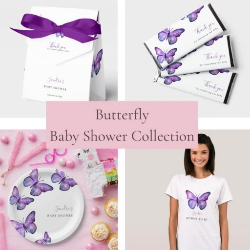 シンプルでエレガントな蝶をテーマにしたベビーシャワーの招待状。裏面にはギフトレジストリー情報とQRコードが含まれています。