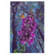 FoxgloveとButterflyはオリジナルデジタ絵画ルだ。紫色鮮やかとピンクの花弁の明るい塔は、木々の列に向かって上昇する。黒とオレンジの蝶が離陸し、背景に風の強い雲を持つ青い空。