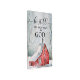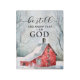引用文感動的聖なる書物、 経典メタルウォールシンプルアートは、木々に囲まれた赤い家に雪が降る冬の水彩風景を描く。聖書の詩詩篇46:10を特集している。「私が神であることを知り、じっとしておきなさい。