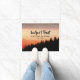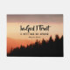 引用文感動的聖なる書物、 経典doormatは、美しいピンクとラベンダーの山の夕日の下に黒いシルエットの松の木で自然の写真を描く。聖書の詩詩篇56:4bは、"神は私の信頼を信じて、私は恐れない。