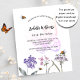 前面に白い背景。ビー飾チと野色彩の鮮やか草が紫とピンクと大きな蝶に囲まれて名前とパーティー・詳細のパーソナライズおよび追加背面:紫の背景。1枚= 1枚の招待状を印刷したエッジからエッジ