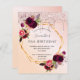 フロント:50歳、50歳(または任意の年齢)の誕生日パーティーへの招待。バラ金ゴールド、赤面ピンク色の背景グラデーションと金ゴールド幾何フレームフェイク。暗い紫飾とブルゴーニュの花、バラとボホスタイルの羽を持つ。フェイクバラ金ゴールドグリッターの乾燥。名前とパーティー詳細のテンプレート。名前は手書文字のスタイルスクリプト、灰色の文字。戻る:バラ金ゴールド、赤面ピンクグラデーション色の背景。