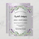 紫のフェイクグリッター、スパークル、ラベンダーの花模様、花とユーカリの緑とフェイク銀色の背景。名前とパーティー・詳細のパーソナライズおよび追加