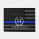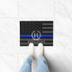薄いブルーライン警察を特色にするモノグラムのなおよび名前をカスタムするの玄関マットは米国旗のスタイルを作りました。 モノグラムは白い文字の下の名字の文字が付いている白い様式化されたリースのの中に集中します。 青を表している間あなたの玄関口で印象を作るエレガントで、スタイリッシュな方法。