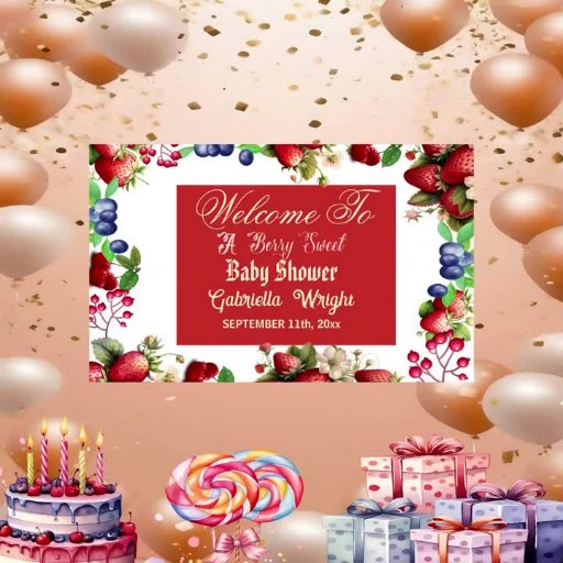 夏の水色の赤イチゴと青い果実を特徴とするかわいいベリースイートベビーシャワーのバナー。アイボリークリームモダンのおもしろいスクリプトフォントと共に、アートワークはバックグラウンカスタマイズドの色を簡単に変更できる!コレクション全体にアクセスして一致するアイテムを探す