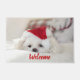 赤いクリスマスの帽子をかぶったかわいい白犬 ドアマット