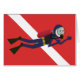赤いダイビングの旗のギフトを持つかわいくおもしろいなスキューバダイバー
