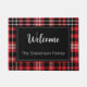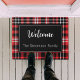 赤いプレイドウェルカムモノグラムのファミリ名 ドアマット