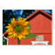 ヒマワリは米国旗が付いている赤い納屋の背景幕に対して立ちます。 ヒマワリ(Helianthusのannuus)はアメリカ大陸へ年次植物の先住民です。 ヒマワリはカンザスの州花です。 カードの背部で、蜜蜂はヒマワリを訪問します。 蜜蜂は重要なpollinatorsです。