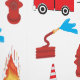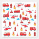 赤い消防車のテーマのパターンは、消防車、赤い火災非常用ヘリコプター、消火栓、消防用ホース、火災と交通用コーンのイラストを含む。緊急車両、消防車、消防車のシーン、消防イラストなどを愛するすべての人のための愛らしいデザイン。