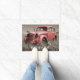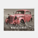 さびクールを離れするために野外の古い赤い車遠くに。かわいいウェルカムマットを作る。
