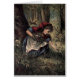 赤ずきんの盗品は彼女の祖母のために開花します。 卑劣なオオカミは間隔の森林の見られたランニングです。