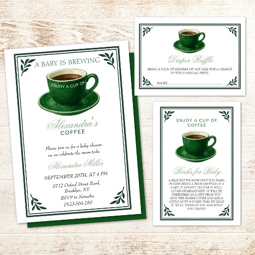 このデザインは、「赤ちゃんがブレンド中」をテーマにしたヴィンテージのベビーシャワーデザインで、緑のコーヒーカップのイラストとエレガントなボーダーが特徴で、高級カフェのような雰囲気を醸しています。この商品は簡単にカスタマイズできます。商品のカスタマイズやマッチング商品が必要な場合は、Zazzleを通じて私に連絡してください。