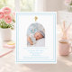 赤ん坊の青い枠と金色の十字を持つ白い背景をパーソナライズし、写真名と詳細を追加する。青文字。アーチ形のフォトフレーム。1枚= 1枚の招待状を印刷したエッジからエッジ