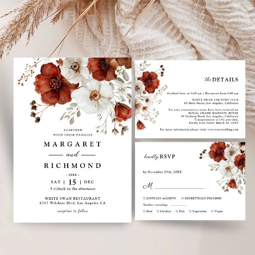 フローラ結婚式招待状素朴な水彩フローラ秋の結婚式招待状赤結婚色赤と白冬の結婚式秋の結婚式赤面アイボリー