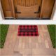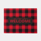 黒いラップの背景に赤いモノグラムのファミリー名と「ようこそ」文字付きの黒と赤のバッファローのチェックを特徴このマットは自分の名前でパーソナライズする与えか、贈り物としてパーソナライズすフェイクる。