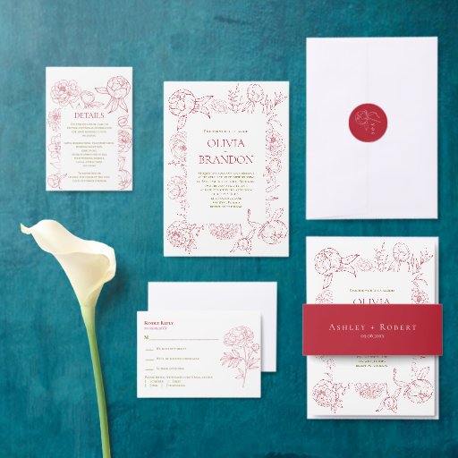 赤い牡丹の線のスケッチがエレガント君の主張を結婚する。お客様は情報を使用してパーソナライズし、お客様のイベントに合わせて色を変更できる。