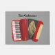 ミュージカルスタイルでゲストを歓迎パーソナライズされたし、黒のスクリプトレタリングで上の名前で灰色の背景に赤のアコーディオンの手描きスタイルイラストレーションを特徴この形式。