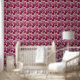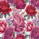 赤いバラ、バーガンディの牡丹、ラベンダーの薄紫の花が組み合わさって、美しく、甘く、ロマンチックで、大きなプリントの壁紙パターンを作る。