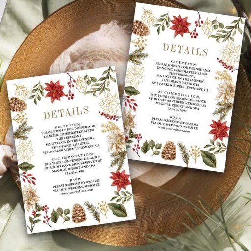 オンラインRSVPのQRコードと美しい赤いポインセチアの花と素朴な松の招待状を備えたエレガントなウェディング離れでゲストを驚かせなさい。単にイベントの詳細をこの使い慣れたテンプレートに追加し、あなたの写真と一緒にこのカードを飾るだけでお気に入りのす。