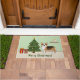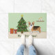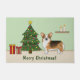 赤い頭の三色のデステイのオリジナル漫画イラストレーションペムブロークウェルシュコーギーは犬を飼育する。犬は赤と黄色のオーナメントと白い飾真珠の花輪と木の上に置かれた黄色い星を持つフェスティバルのクリスマスツリーの横に立っている。木のそばには包まれたプレゼントが2本あり、犬の後ろにキャンドルが2本ある茶色の棚がある。床の色はベージュ、背景色は薄緑。現在はパーソナル化された文字エリア読も存在する: "Merry Christmas!"。
