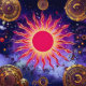 「踊りの火」太陽の光は、炎が生きているように与え、太陽の催眠的な渦巻きと黄金の炎は動きの錯覚をもし太陽の引き起こす。複雑な最高傑作祝のエネルギー、暖かさ、そして赤、オレンジ、黄、青の色と天のバランス。