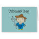 小さいブロンドの農家の男の子との農家の男の子のカード、Tシャツ、マグ、ステッカー、および多くはピッチのフォークを握る青いつなぎ服で服を着ました。