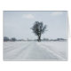寒い冬の日にスウェーデンの雪の多い田舎道。大きな木は道路の横に小さな村の距離にある。写真。