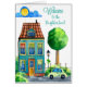 屋根の上に坐る黒い子猫が付いている高い水彩画の家のこの明るく、陽気なデザインの近隣に新しい隣人を歓迎する完全な方法。