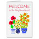 Judyアダムソン著作の手塗りのペーパーコラージュからの明るく着色された花のポットが付いているかわいらしい「近隣への歓迎」カード。 フロントカバーの文字を(例えば違うな年齢、人または言語)どうにか変えられて好んだら、私の店を通して私に連絡すれば私はそれを早急にして幸せです。