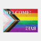 美しいプログレスプライドLGBTレインボーフラグとビーチ写真の背景。虹の旗はLGBTプライドのシンボルであり、このフォーマットは素晴らし、コミュニティのサポートを示す方法である。一方が「ようこそ」と言い、反対側が「バイバイ!」と言う。あなたのパーソナライズされた家族の名前や中央の短いメッセージと一緒である。これは素晴らし、ゲイ、レズビアン、バイセクシャル、トランスジェンダーなどの友人や家族への贈り物となる。