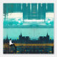 モダン夕暮れ芸術的の街並みを写生する鮮やか人の姿。ティール(緑がかった色)とオレンジ色のトーンのブレンドは、ダイナミックな都市を作り感じ出し、クリエイティブの宇宙や都市をテーマにした装飾に最適。