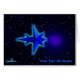 星空シンプルの背景に重ね合わせた定型化された宇宙船に似た青い色調の3Dフラクタル画像。同心円状のリング(重力波?)が宇宙機から宇宙の空っぽの真空に放出される。明るい青のオーラが宇宙船を取り囲み、おそらく光よりも速く移動する結果である。
