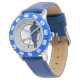 これは野球ファンの男にとって魅力的なスポーツウォッチだ。青い野球選手とこうもりのシルエットが特徴で、白いボールのイメージに赤いステッチが施されている。イメージは明るいグレーの背景に配置される。赤いダイヤモンドの形のティックマークは時間を示す。*このデザインはimage © Graphics Factory.com*を使用