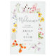 ワイルドフラワーカントリーカラフルウェディングウェルカムメタルプリントのサイン結婚は、白い背景にオレンジ色、黄色、紫かわいらし、ピンク色の国の花を中心に、歓迎サイン情報を持つ結婚。提供されている文字・ボックスで文字を編集してパーソナライズ。©2024 Evco Studio www.zazzle.com/store/evcostudioで設計