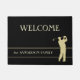 金ゴールドのシルエットのゴルファーはこのゴルフテーマのドア・マットの右側で最高潮を取ります。 薄い金ゴールドはフレームを一致の金ゴールドのあなたの姓か他のカスタムな文字並べ、またカスタマイズ可能である上の文字分野は現在歓迎を言います。 イメージおよび文字は黒い背景に置かれますが、選択によってカスタマイズそれを背景色を変えることができます。