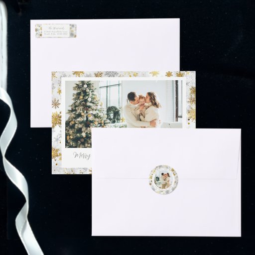 この祝金ゴールドと銀エレガントのスノーフレークのクリスマスのポストカードでホリデーシーズンは、フェスティバルと方法で家族の写真を表示するように設計スタイリッシュされた。キラキラ輝く雪縁ど片は、あなたの個人的な写真に焦点を当て保ながら、輝きのtouchを追加する。友人や家族に温かい願いを送るのに最適なポストカードで、クリスマスと新年の挨拶に最適。自分の文字や写真で簡単にパーソナライズし、愛する人々が何年も大切にする記念品を作る。今年とモダンそれ以降の休日の郵送物のための時間のないデザイン。デザインもしまたは一致する製品に関するサポートが必要な場合は、zazzle@fivelittlelemons.comまでメールでお問い合わせください